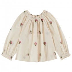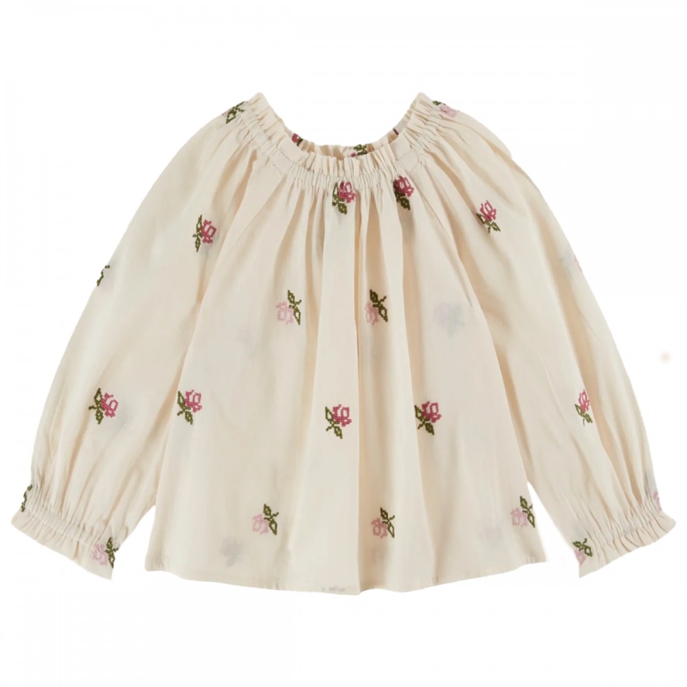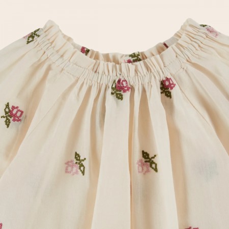 Blouse en coton écru parsemé de fleurs roses et vertes brodées au point de croix.
