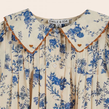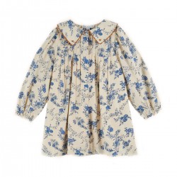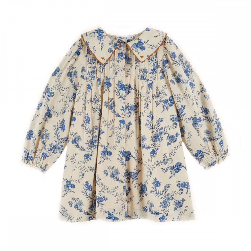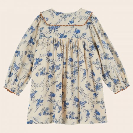 Robe ample en coton ornée de fleurs bleues sur fond écru.