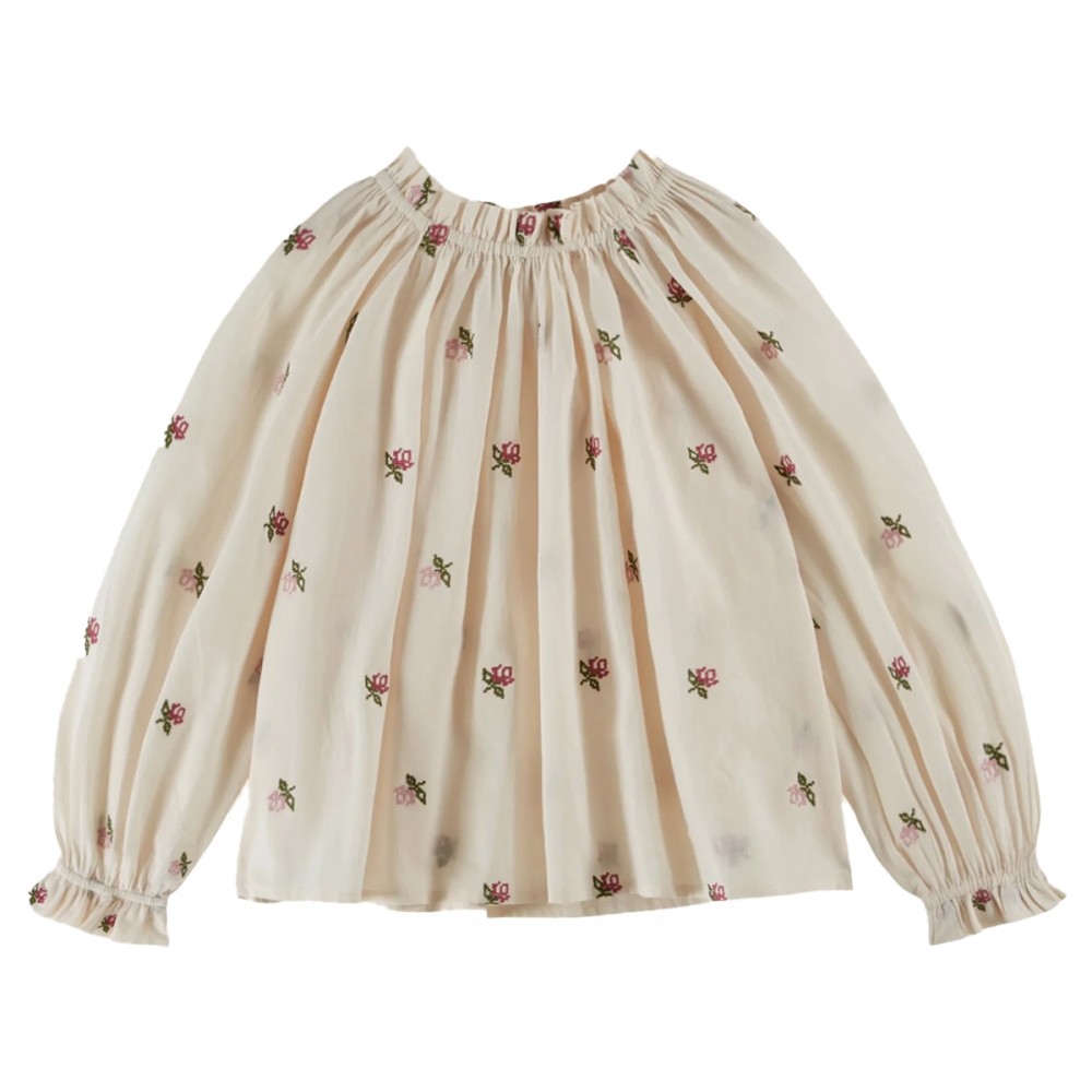 Blouse en coton écru parsemé de fleurs roses et vertes brodées au point de croix.