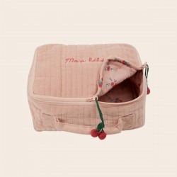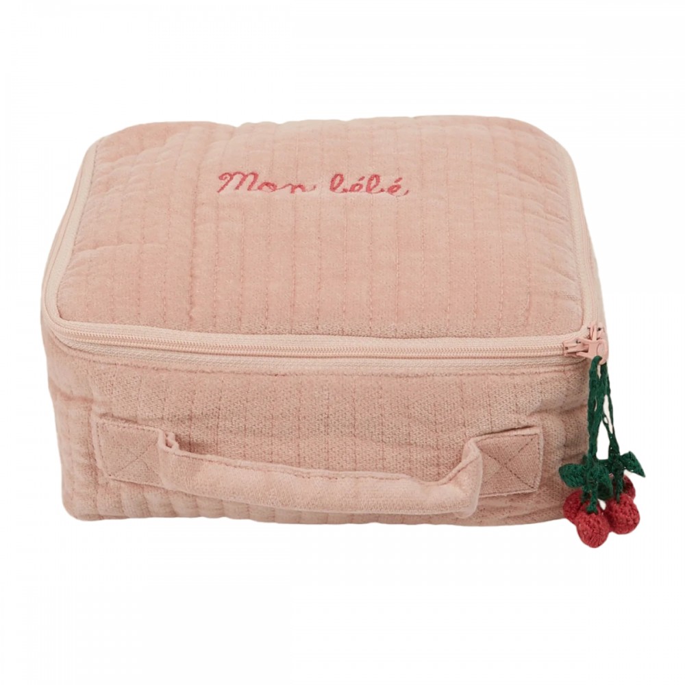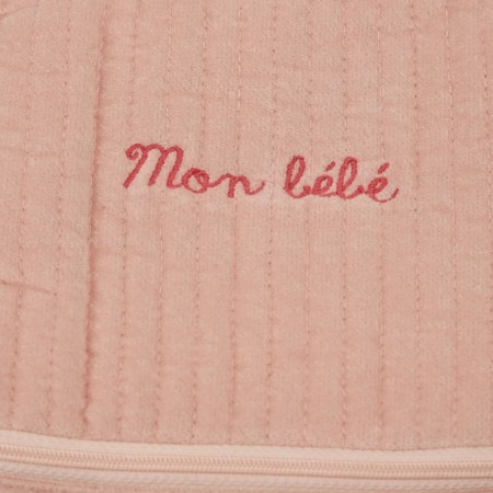 Trousse de naissance en velours de coton rose molletonnée. Une broderie rose " Mon Bébé " égaye le dessus de la mallette.