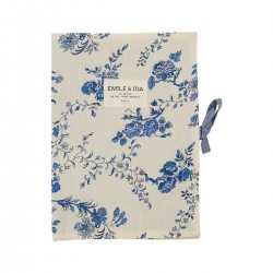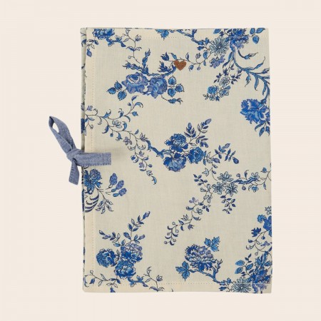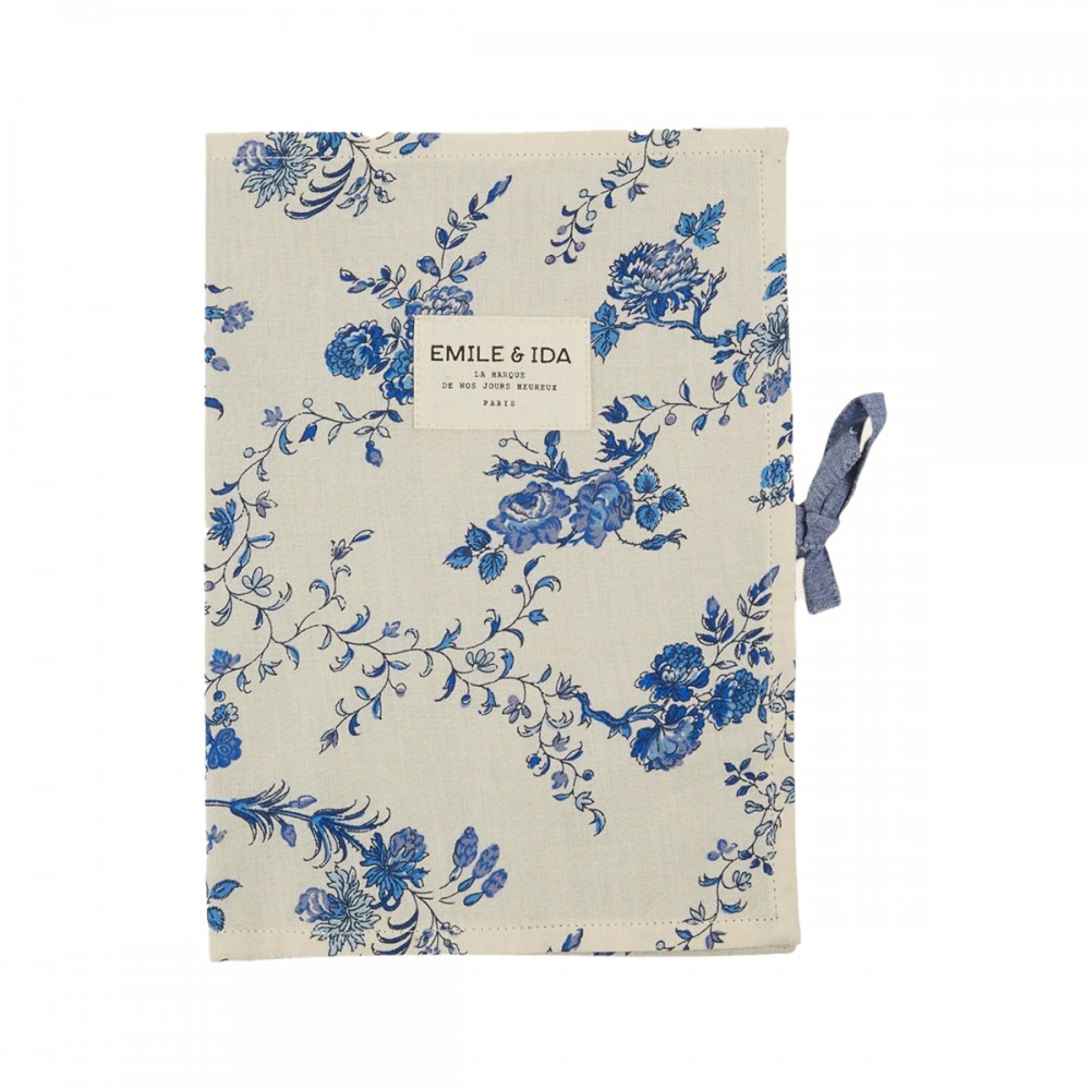 Couverture pour carnet de santé en flanelle de coton molletonnée écrue parsemé de fleurs bleues. Elle est doublée en coton chambray. Une jolie couverture qui personnalise vos documents.