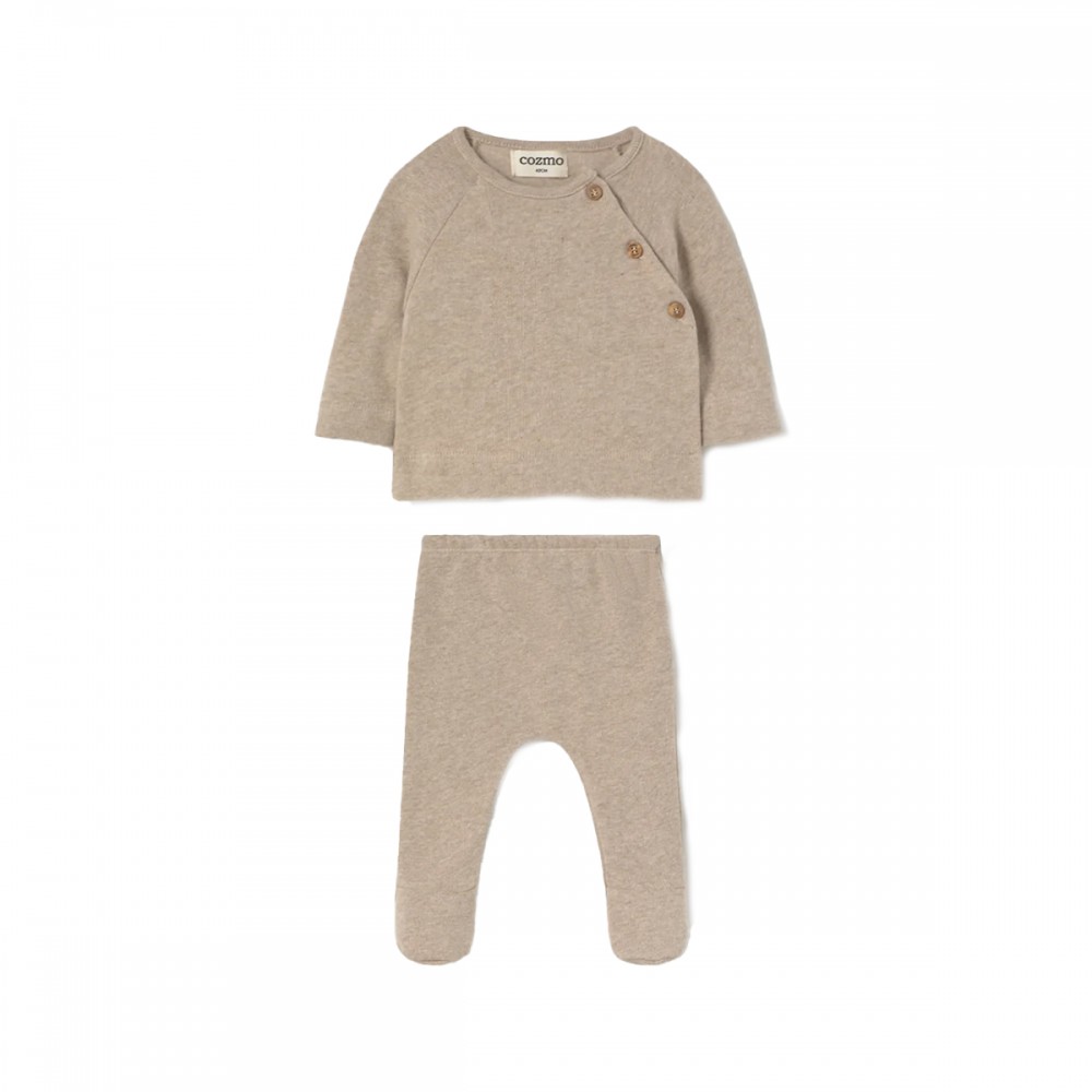 Ensemble deux pièces pour nouveau-né de la marque Cozmo, composé d'un cardigan cache-cœur et d'un pantalon à pieds assorti en maille ultra-douce. Les deux pièces sont brossées à l'intérieur comme à l'extérieur pour une chaleur et un confort exceptionnels, assurant le confort de bébé tout au long de la journée.