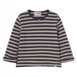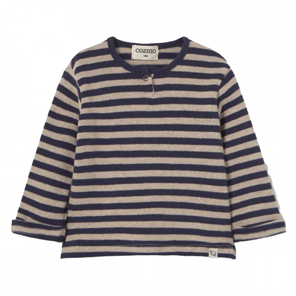 Pull bébé rayé de la marque Cozmo en maille douce, brossé à l'intérieur comme à l'extérieur pour plus de chaleur et un toucher doux et agréable. Il présente une encolure ras du cou unie contrastante avec une fermeture à boutons-pression sur le devant pour un habillage facile. Les poignets retroussés et les fentes latérales apportent une touche finale décontractée à cet essentiel douillet, parfait à superposer par temps frais.