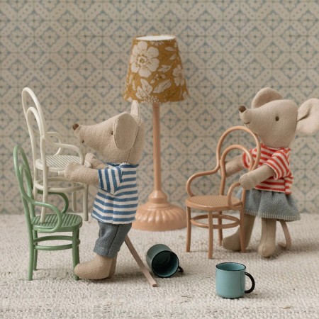 Une chaise vintage qui convient aux souris Petit(e)s sœur/frère et Grand(e)s sœur/frère. Elle s'intègre parfaitement aux différents environnements des souris et s'associe aux autres meubles et accessoires de taille Souris.