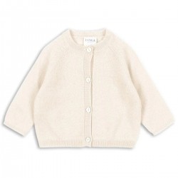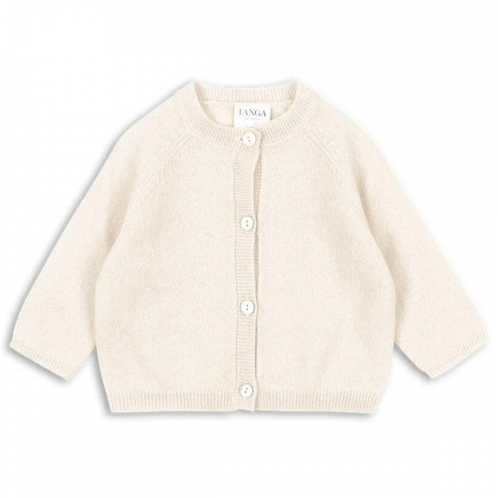 Cardigan Savora blanc antique de Fanga Fontana. Ce cardigan en laine exceptionnellement doux et confortable est doté de boutons en nacre sur le devant, d'ourlets côtelés décoratifs et de manches raglan. La couche idéale pour garder bébé bien au chaud et à l'aise.