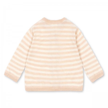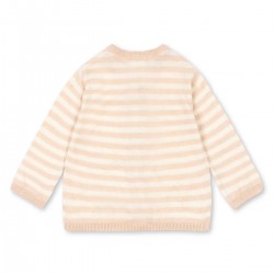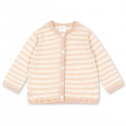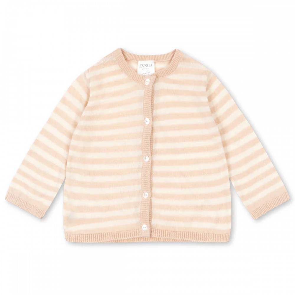 Joli gilet de la marque danoise Fanga Fontana tricoté dans un joli motif rayé rose clair et ivoire blanc.