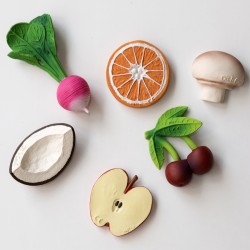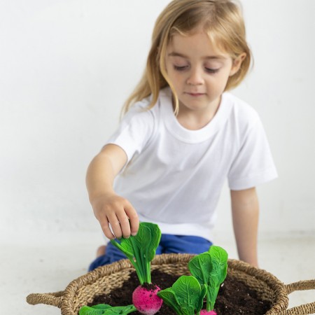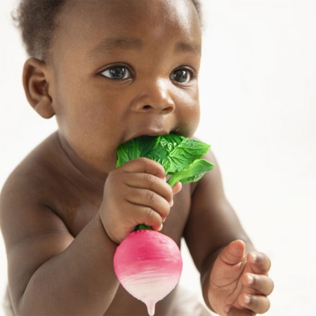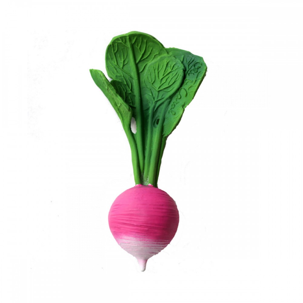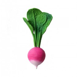 Le radis Oli & Carol est conçu en latex d'hévéa 100% naturel, sans PVC, sans BPA, sans phthalates et peint à la main avec des pigments naturels extraits de plantes.
