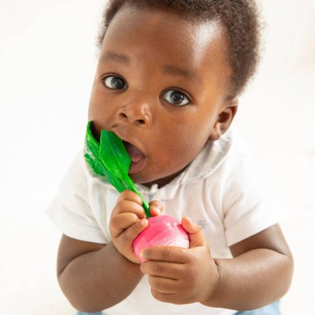 Ramona le radis est un petit jouet pour bébé qui peut servir comme jouet de dentition, de bain ou comme objet décoratif. Un jouet écologique sans danger pour l'enfant.
