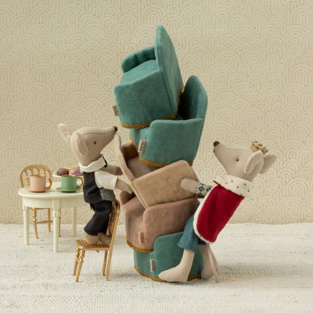 Dans son élégant costume aux motifs géométriques, sa cape royale doublée de rouge et sa couronne dorée scintillante, ce Roi Souris est prêt à accueillir la cour au grand complet dans le château Maileg. Il incarne à merveille l’imaginaire et les histoires féeriques que les enfants adorent inventer.