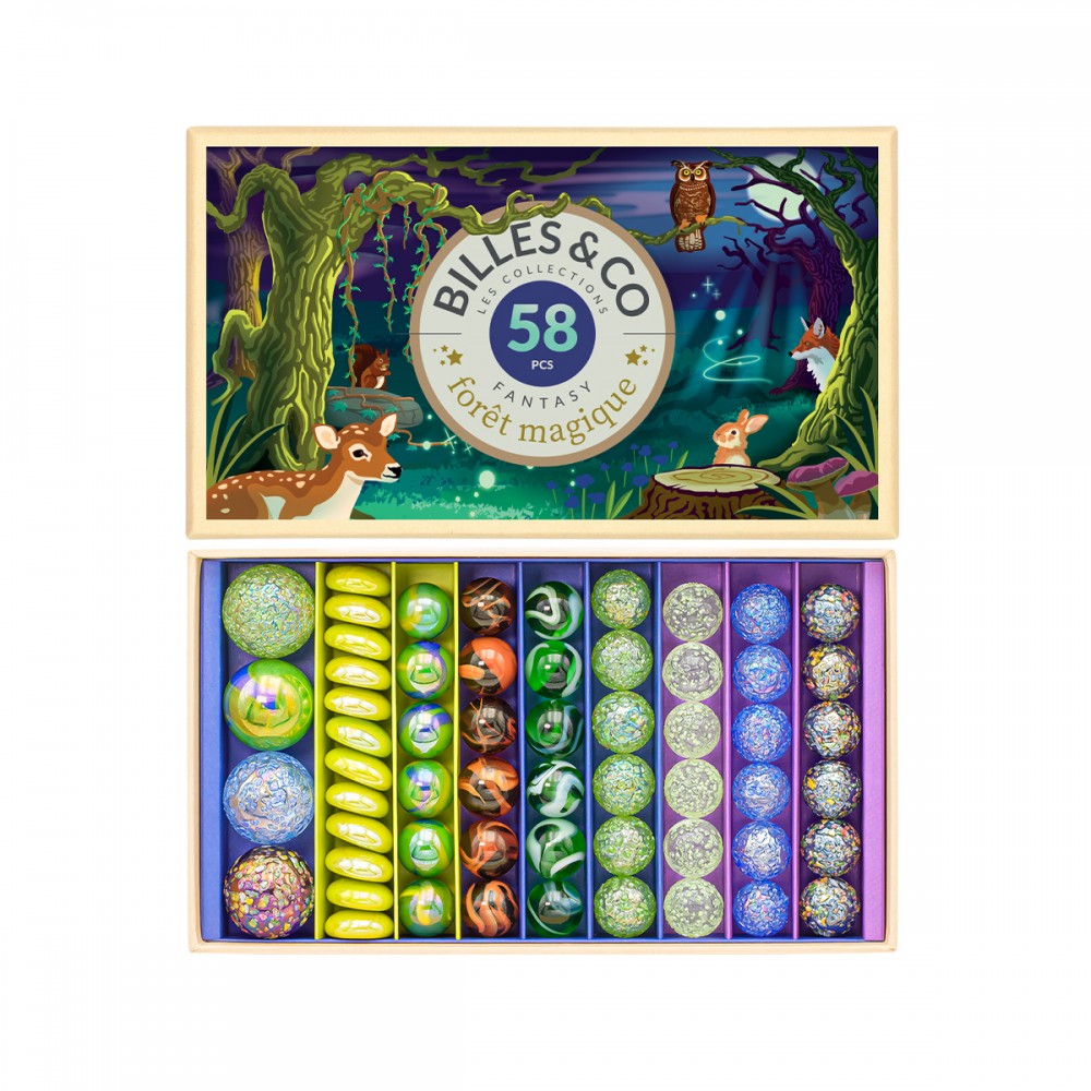 Découvrez le coffret de 62 billes sur le thème de la forêt magique, la marque Billes & Co met en valeur ces petites boules de verre avec lesquelles tous les enfants ont joué afin d'en faire des trésors de pierres précieuses.