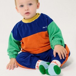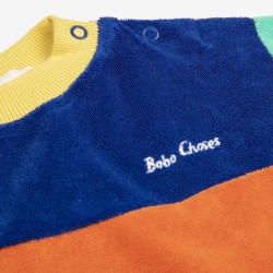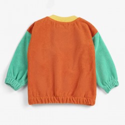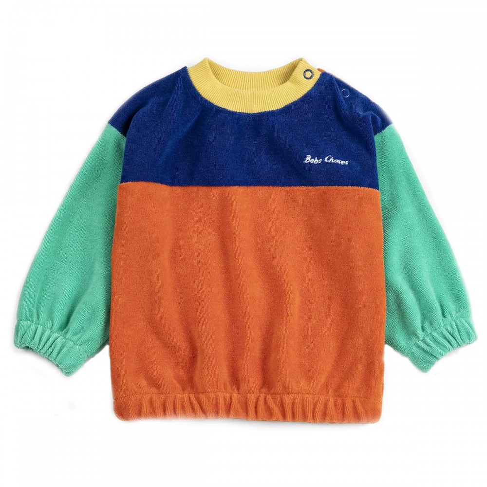 Sweat en éponge multicolore comportant des manches longues, des emmanchures basses, une fermeture par bouton-pression à l'épaule, un ourlet et des poignets élastiques, une broderie, une coupe ample et un col rond.