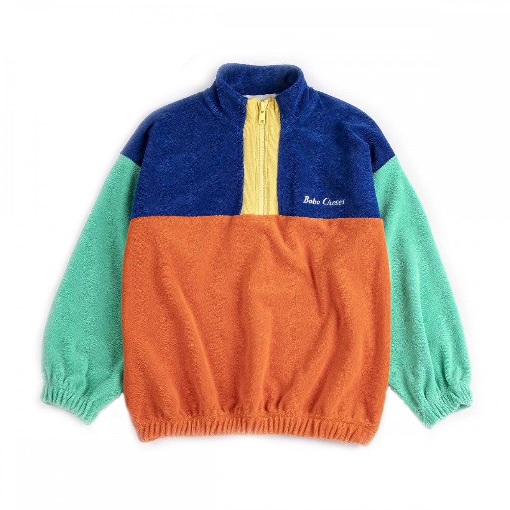 Sweat multicolore en éponge de la marque Bobo Choses présentant une fermeture zippée sur le devant, un ourlet et des poignets élastiques, une broderie, une coupe ample et un col montant.