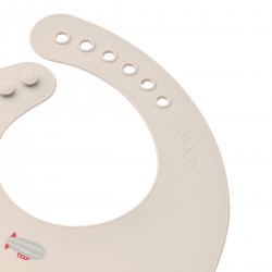 On adore le revêtement imperméable et très facile d'entretien mais aussi la possibilité de régler le bavoir à l'aide de petits boutons ajustables au cou du bébé.