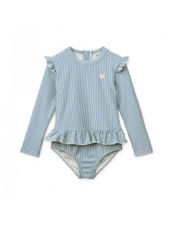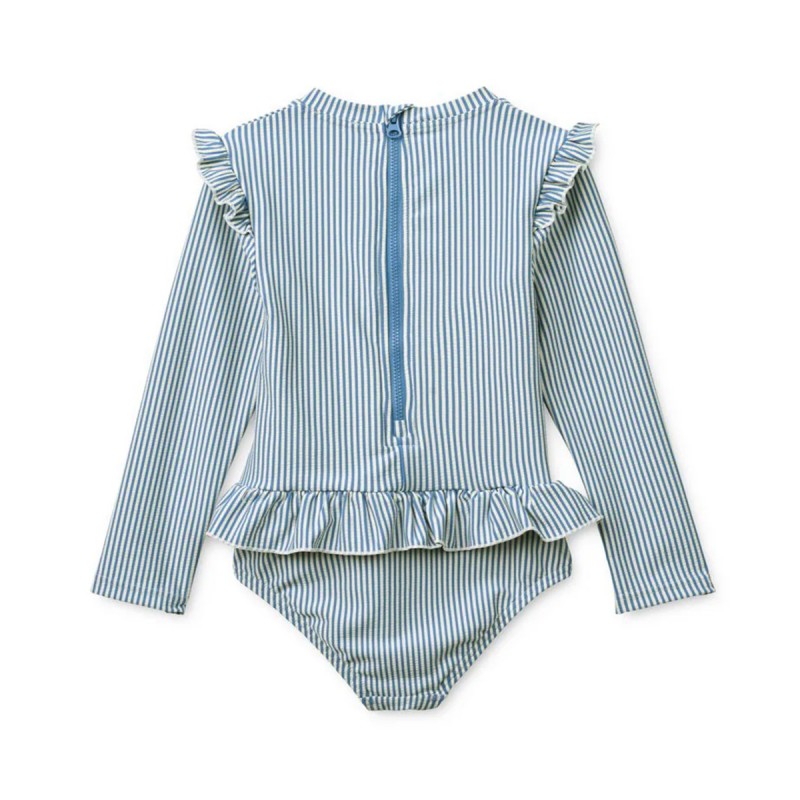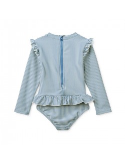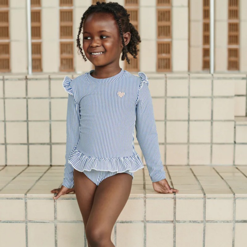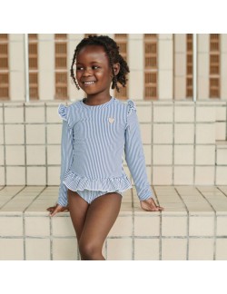La sublime nouveauté : Le maillot de bain UV "Sille" une pièce manches longues en seersucker est totalement girly avec ses petits volants.