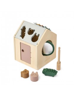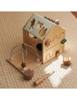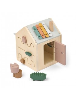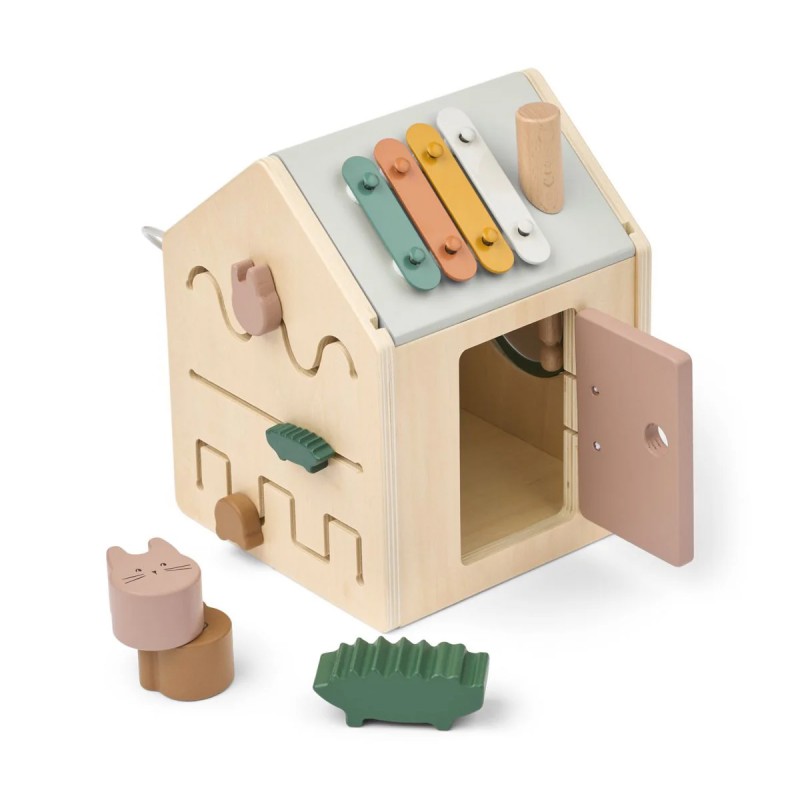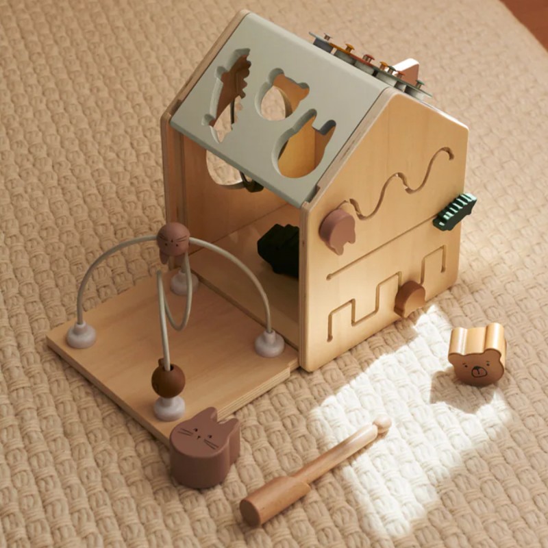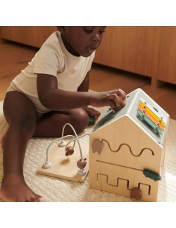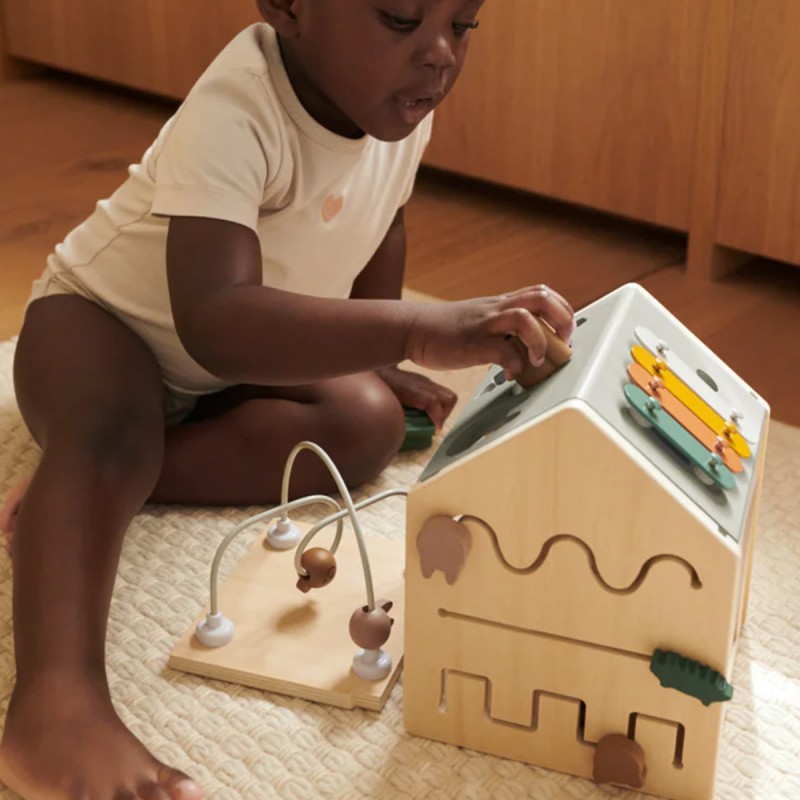 En forme de petite maison ludique, le cube d'activités Lucas de la marque Liewood accompagne les enfants dans leurs premières découvertes. Chaque face propose une activité différente pour éveiller la curiosité et encourager la manipulation : boîte à formes, labyrinthe de perles, miroir rotatif ou encore porte à ouvrir. Sur le toit, les enfants découvrent un xylophone amusant avec une baguette dissimulée dans la cheminée, ainsi qu'une boîte de puzzle pour développer leur logique.