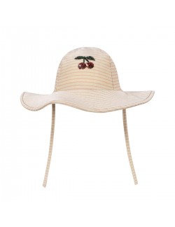 Un joli chapeau de la collection de Konges Slojd avec protection UPF50+ et une cerise en sequin accompagné de fines rayures roses est parfait pour le porter les jours ensoleillés et protéger les enfants du soleil à la piscine, à la plage ou à la montagne.