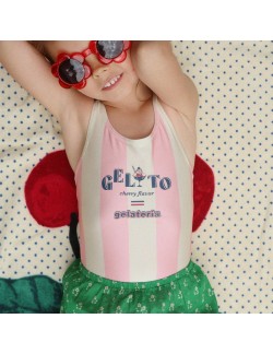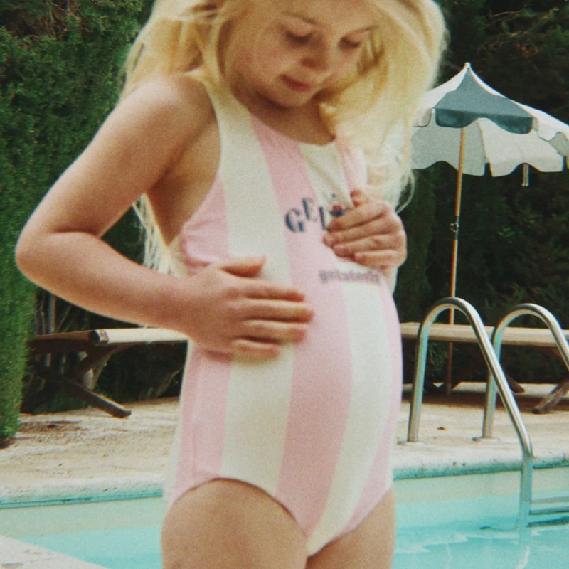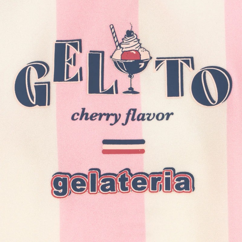 Le maillot de bain "Pomia" est conçu avec de larges rayures pastels sur l’ensemble évoquant les teintes d'une délicieuse glace à la cerise.
