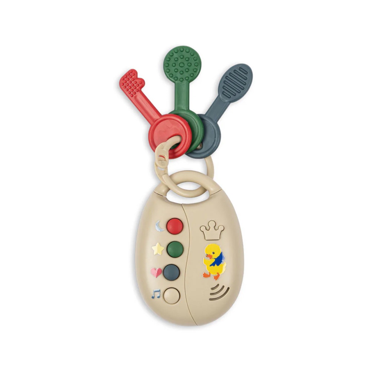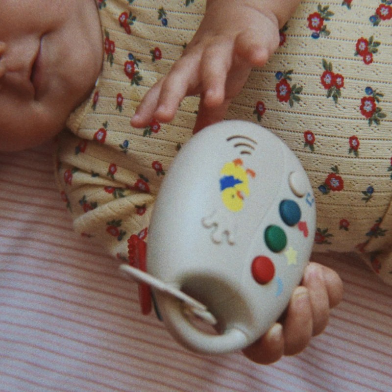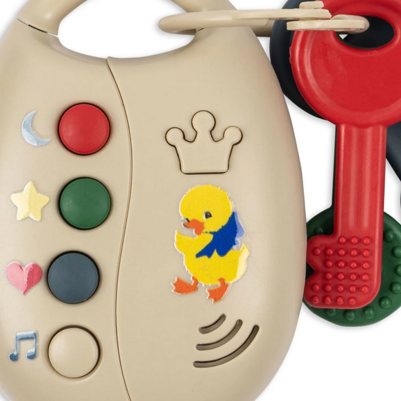 Ce jeu de clés de la marque Konges Slojd comprend un anneau de dentition sûr, idéal pour soulager les gencives douloureuses, ainsi que plusieurs options musicales amusantes à découvrir, notamment : - Son de klaxon - Son de démarrage de voiture - Son de serrure - Lumière -