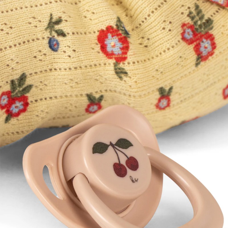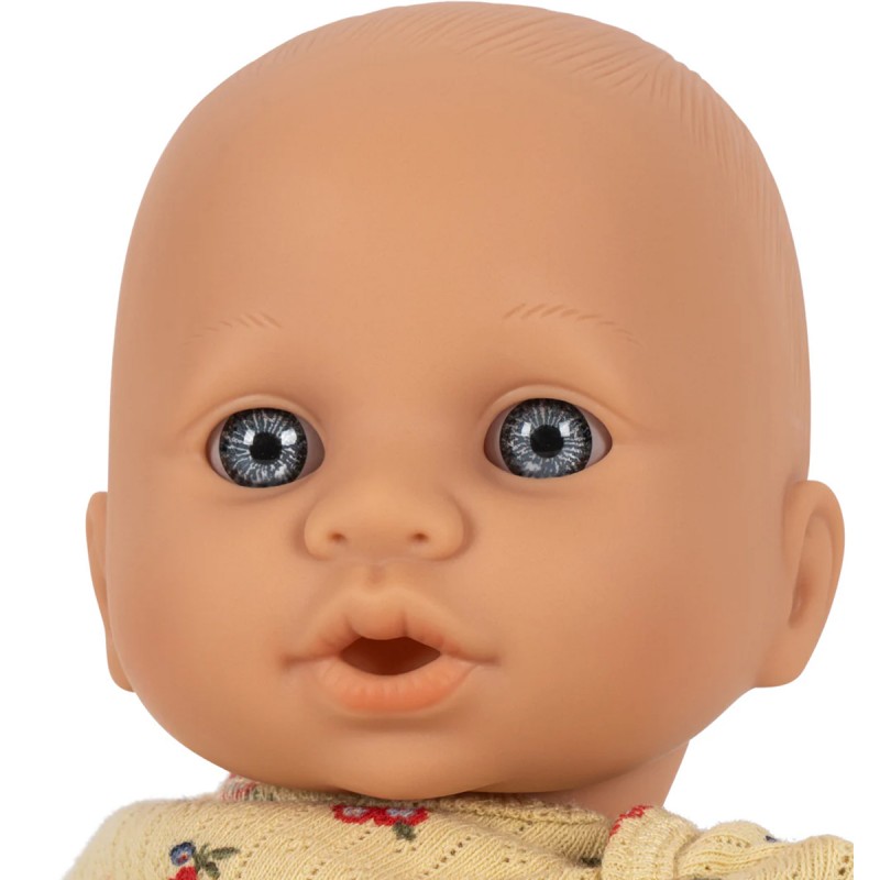 - Matières : Coton biologique (vêtements), polyester (rembourrage), polypropylène (tétine) et vinyle (poupée)