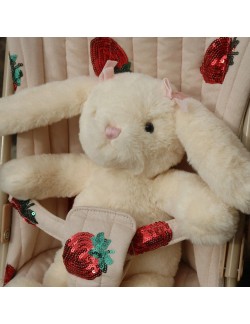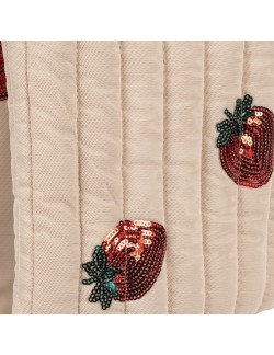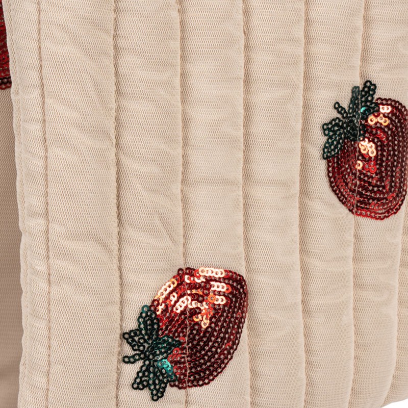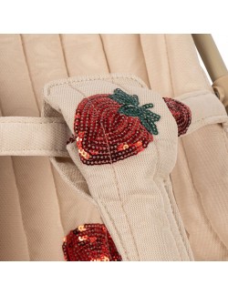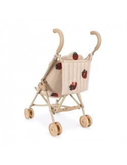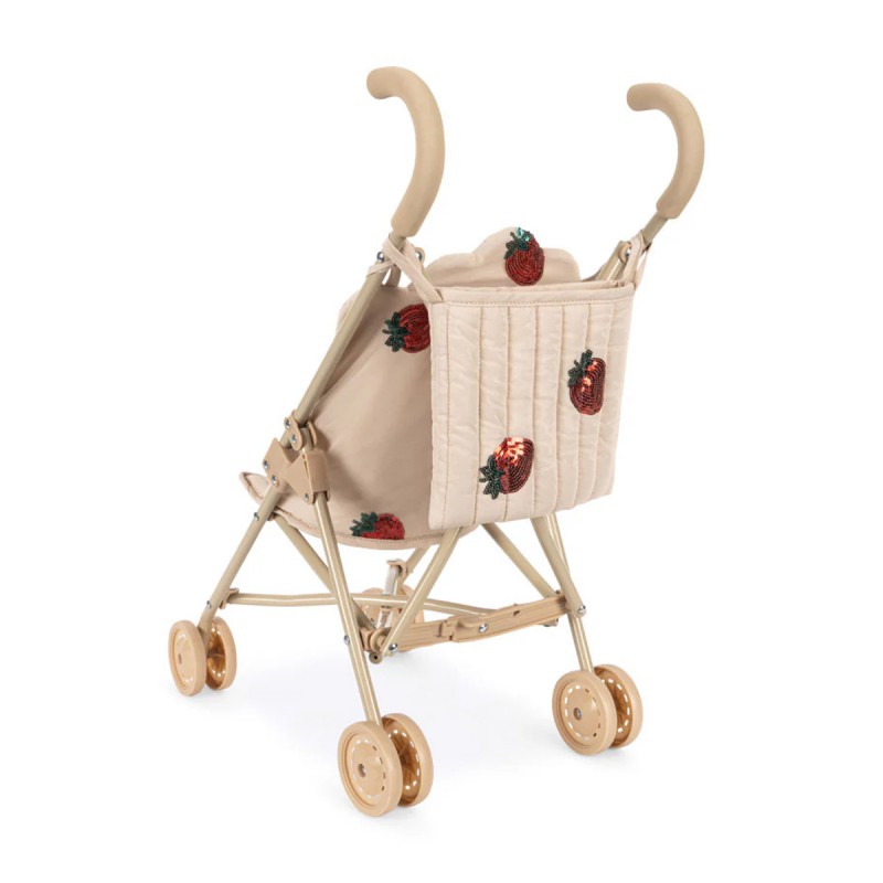 Avec son tissu matelassé beige délicatement orné de fraises brodées en sequins, cette poussette canne Konges Sløjd est un vrai coup de cœur. Elle combine élégance scandinave et jeu symbolique, pour accompagner les enfants dans leurs histoires du quotidien.