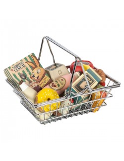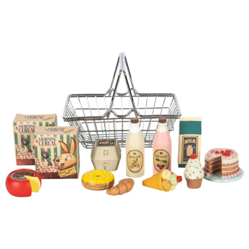 Laissez libre cours à l'imagination de votre enfant avec le Mini Marché de Konges Slojd. Composé d'une multitude d'aliments factices aux couleurs vives et d'un joli panier en métal, il est le compagnon idéal pour des aventures de courses imaginaires avec des peluches et des poupées.