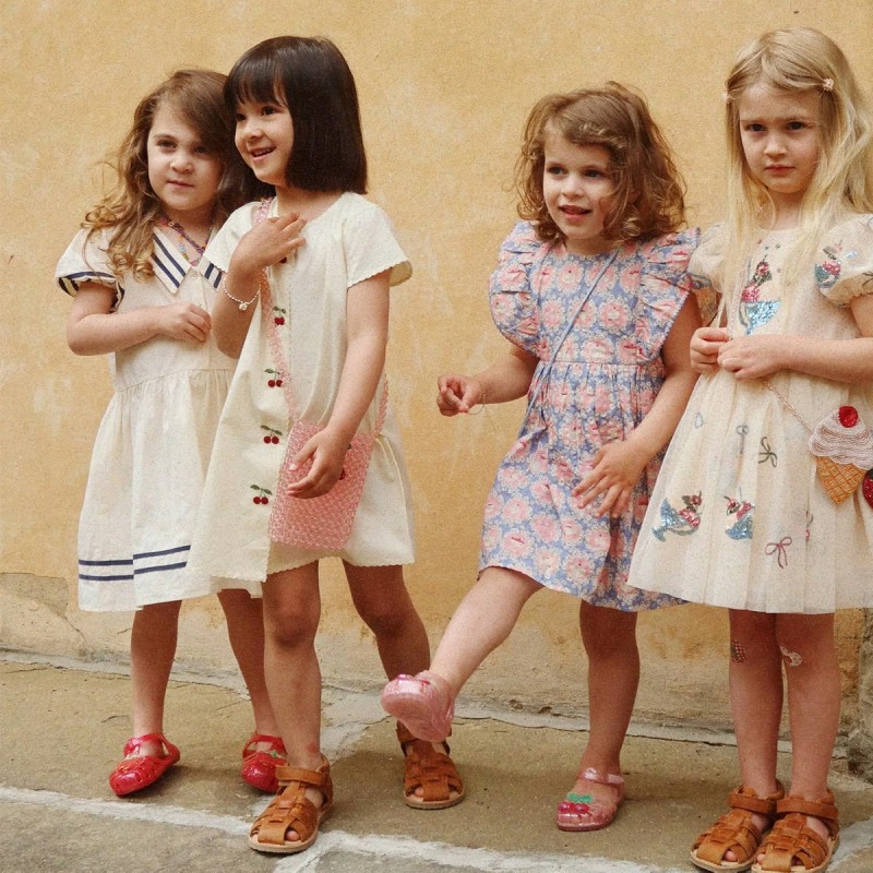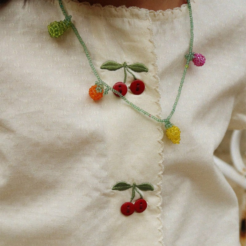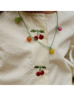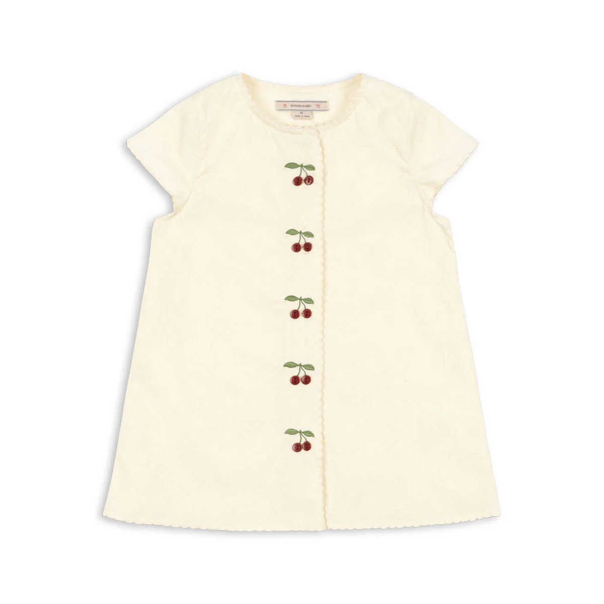 Le devant de la robe pour fille est orné de broderies et de boutons décoratifs en forme de petites cerises, qui attirent l'attention et soulignent le style estival.