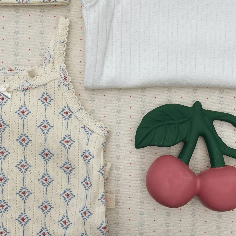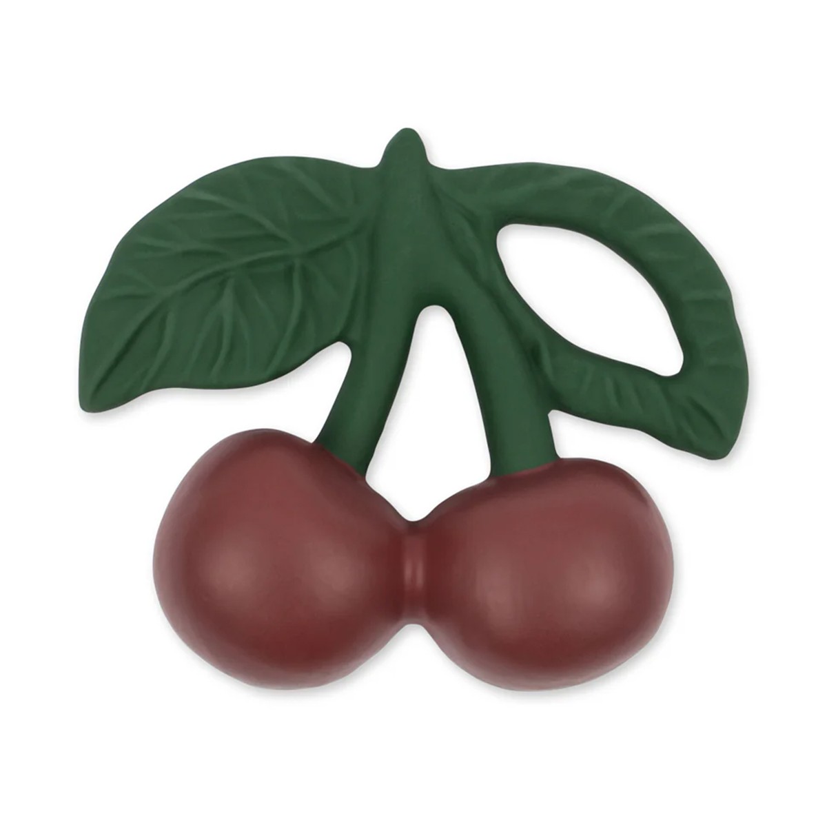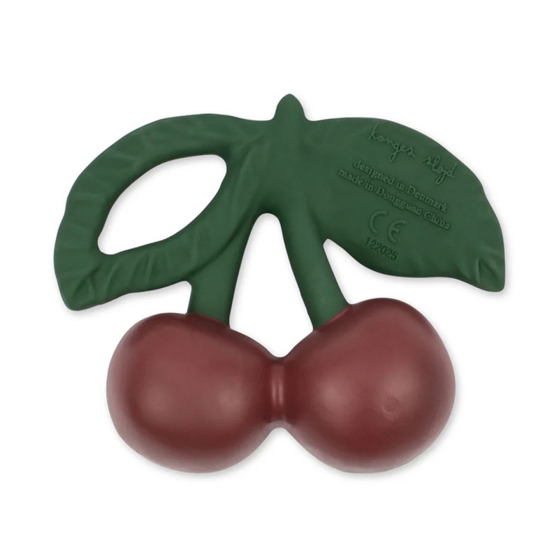 Un adorable petit anneau de dentition en forme d'une cerise, fruit emblématique de la marque Konges Slojd, facile à saisir et à tenir.