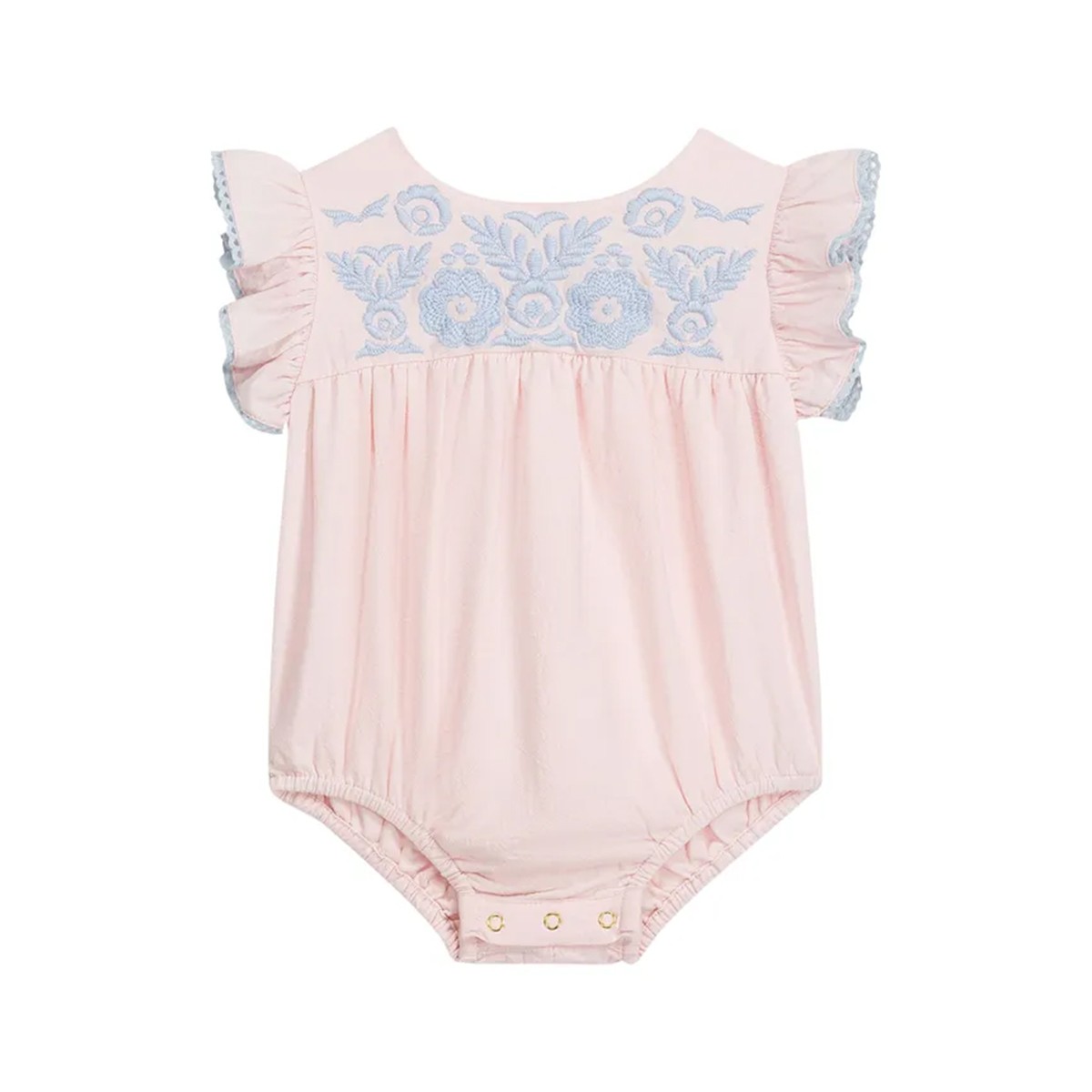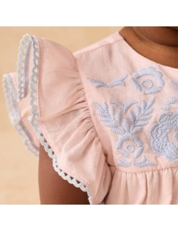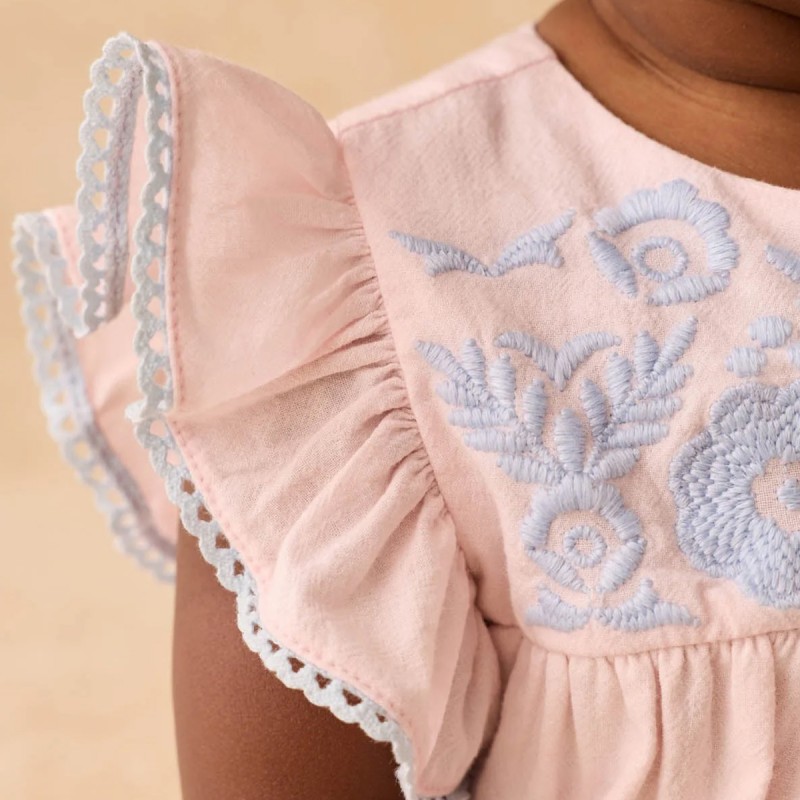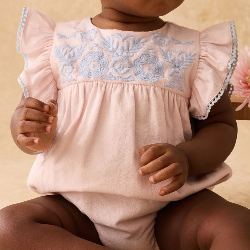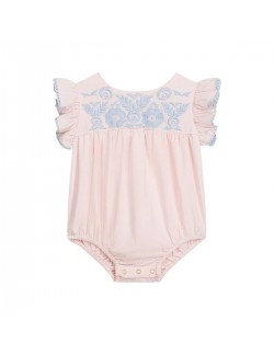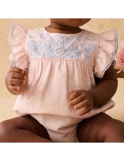 La barboteuse en coton doux et léger "Nusha" de la marque Louise Misha ne peut que vous faire craquer avec ses jolies broderies et ses manches festonnées.