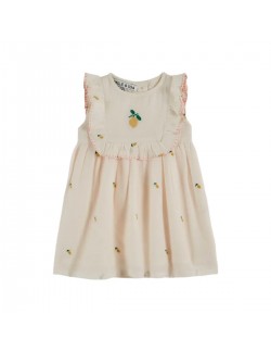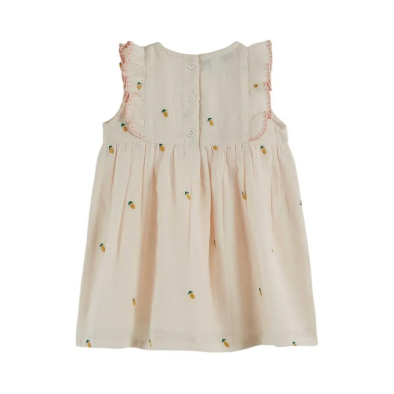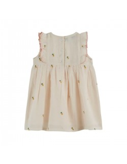 Robe bébé sans manches en gaze de coton biologique crème, entièrement doublée pour plus de confort. Le plastron est orné d'une broderie de citron en son centre, encadré d'un volant ourlé au point de grébiche. L'ouverture boutonnée sur la hauteur du plastron dans le dos facilite l'habillage. La jupe froncée, soutenue par le corsage, se pare de mini citrons jaunes brodés en all-over, tout comme le plastron dos et le volant. Un détail printanier et raffiné pour les beaux jours.
