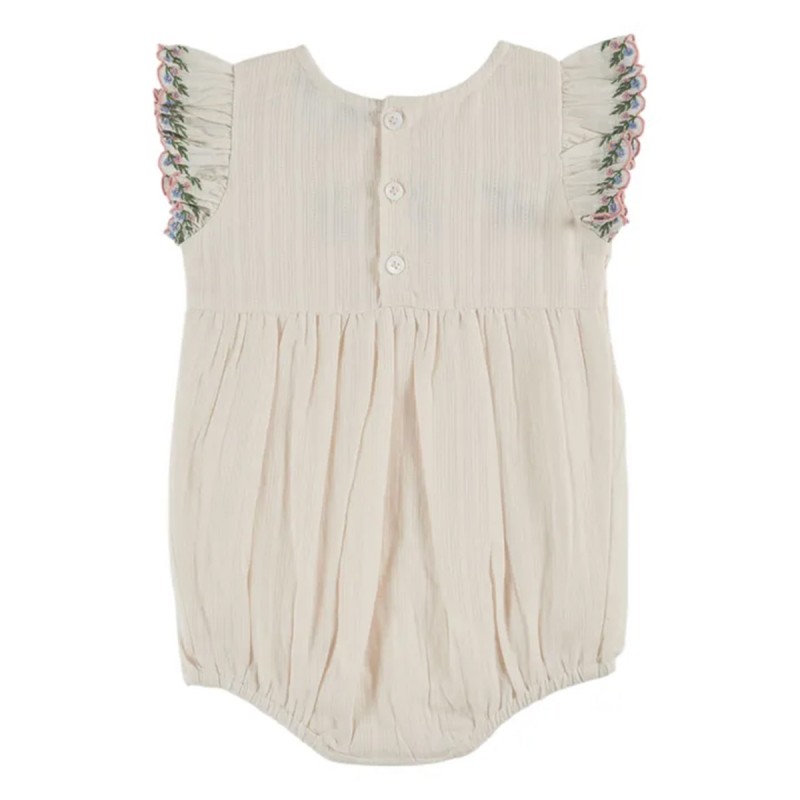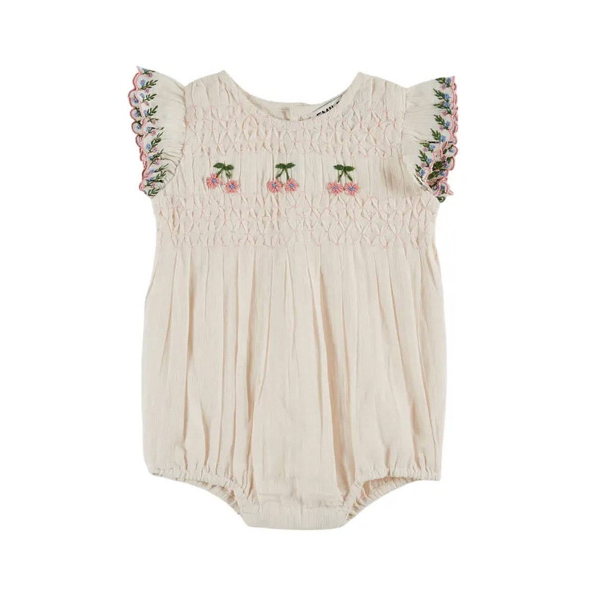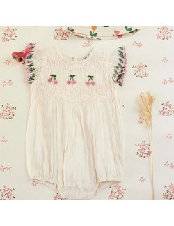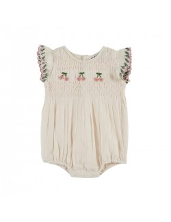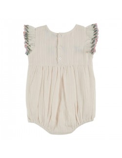 Forme bouffante avec bandes de smocks faits main devant et fleurs roses brodées à la main. Encolure ras du cou rehaussée de volants brodés et festonnés autour des entournures. Tour de cuisses resserré par un élastique caché pour un ajustement parfait. Ouverture pressionnée à l'entrejambe et ouverture boutonnée sur l'empiècement dos pour faciliter l'habillage. Entièrement doublée en voile de coton pour plus de confort.