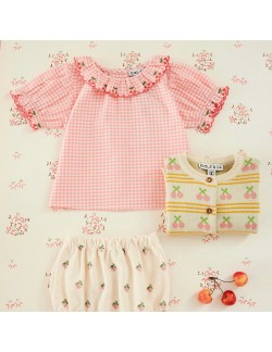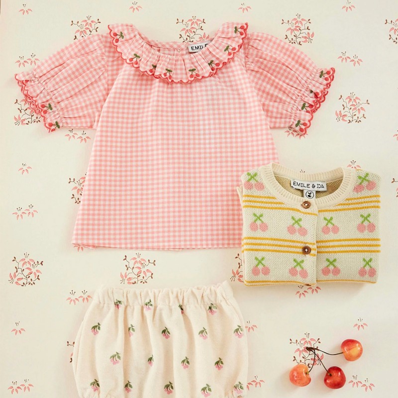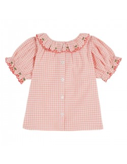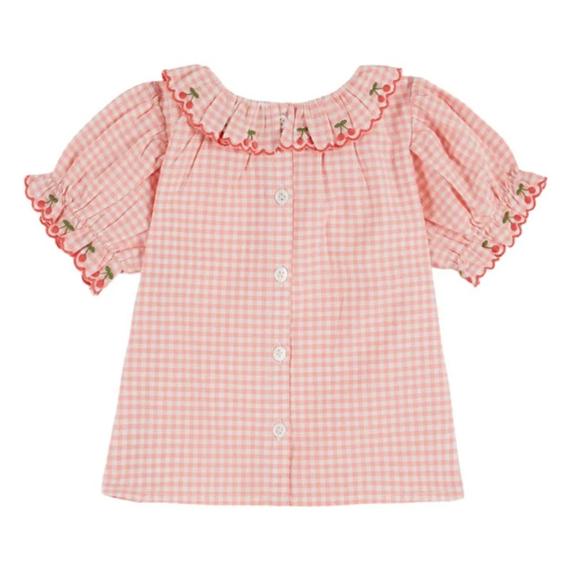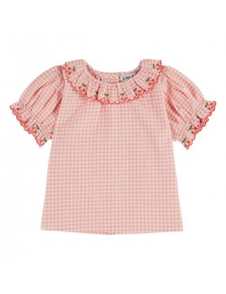 Le chemisier Émile et Ida arbore un délicat imprimé vichy rose, apportant une touche d'élégance intemporelle à la garde-robe d'été de votre enfant. Conçu avec un joli col où sont brodés des petites ceries et des manches courtes légèrement bouffantes.