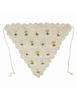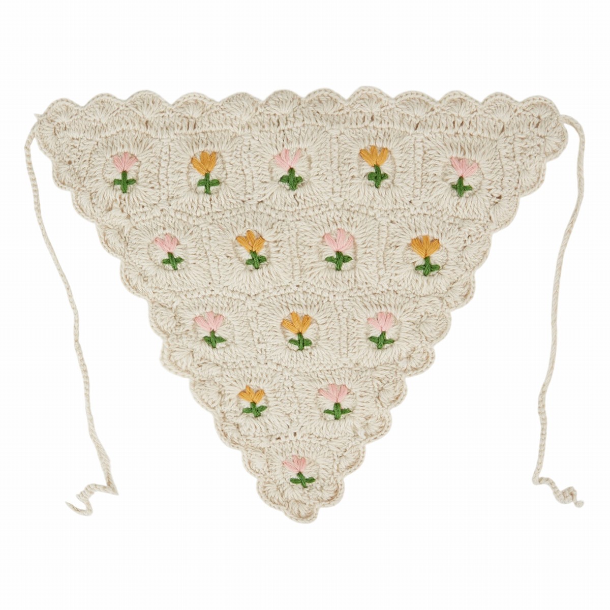 Foulard de tête triangulaire écru en crochet, orné de tulipes brodées à la main. À porter sur les cheveux sous le soleil, il reste bien en place grâce à deux cordons crochetés, à nouer sous le menton ou sur la nuque, selon vos envies. Son pourtour joliment festonné, rappelant un fanion de fête, en fait un accessoire à adopter sans modération.