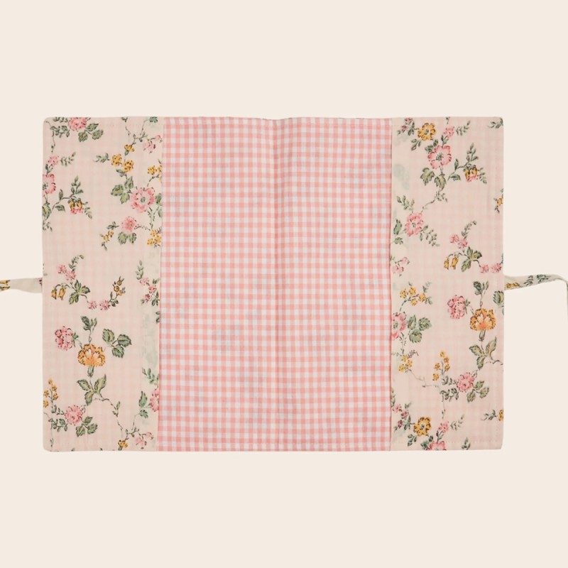 Couverture pour carnet de santé en flanelle de coton avec un joli imprimé fleuri et doublé avec un tissu vichy rose. Une jolie couverture qui personnalise vos documents.