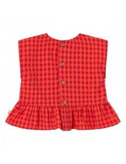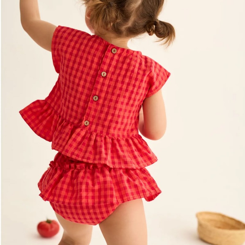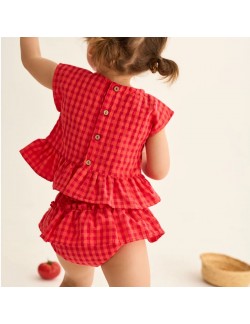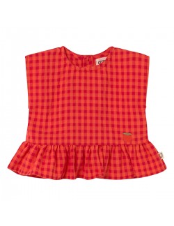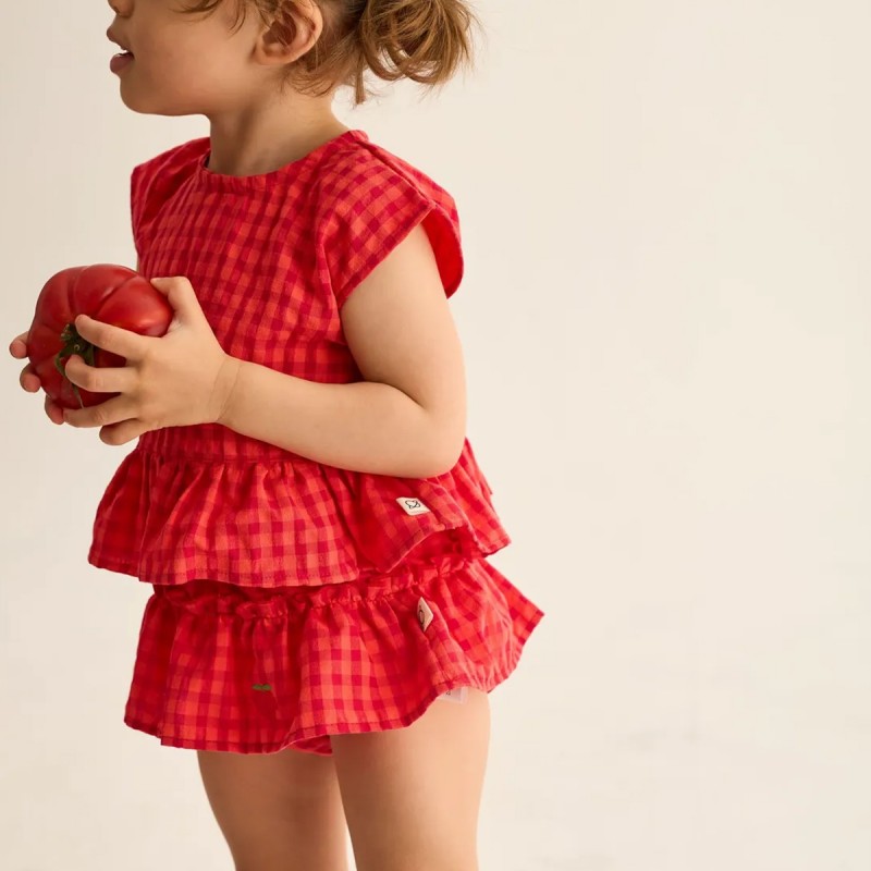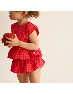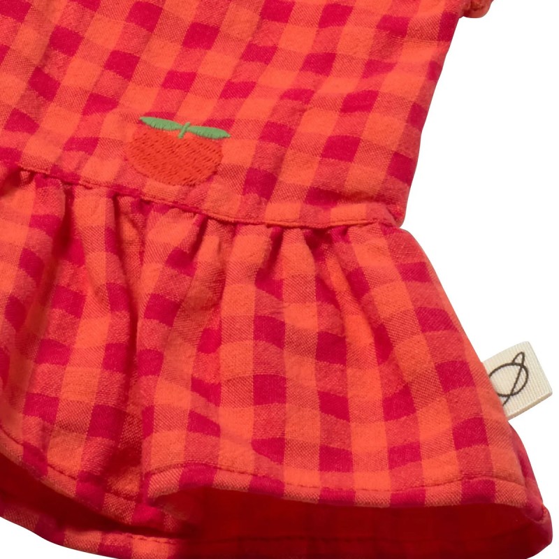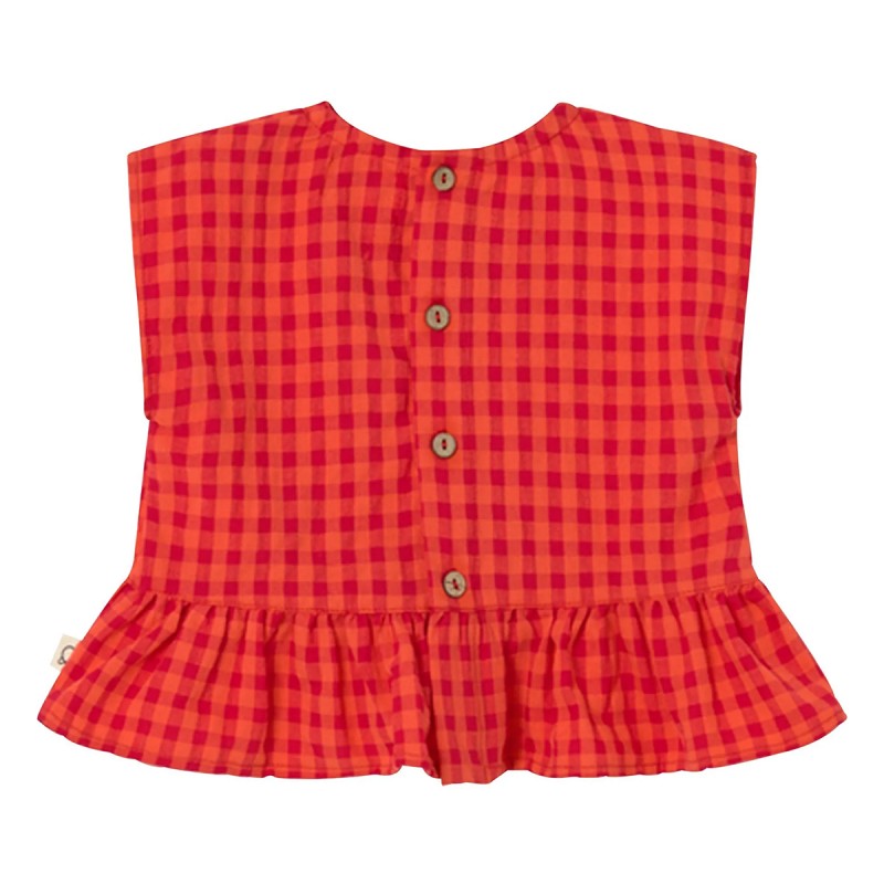 Petit top en coton pour bébé fille, orné d'un motif vichy frais et gai de la marque Cozmo. Il présente une encolure ronde boutonnée au dos, sans manches, et un ourlet à volants froncés. Une pomme brodée orne le devant.