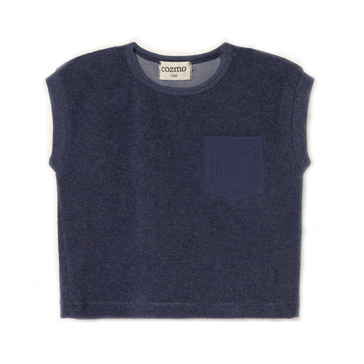 Il possède une encolure ras du cou côtelée avec boutons-pression sur l’épaule gauche et une poche sur la poitrine plaquée en gaze de coton qui apporte du contraste et un style confortable.