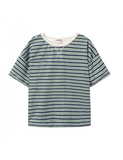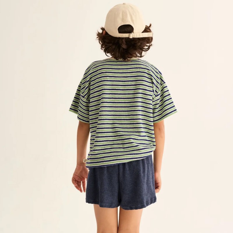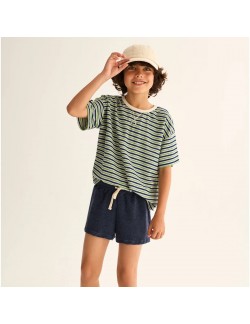 T-shirt rayé garçon en éponge douce. Il présente un col rond côtelé orné d'une broderie en forme de X, des épaules tombantes, des manches courtes et un empiècement arrondi à l'intérieur pour un confort optimal et une grande liberté de mouvement.